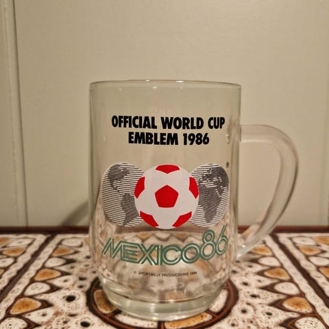 Camus Mexico 86 Pique konjakkflaske i keramikk. Flasken er formet som en fotball og står på en sokkel merket «Cognac Camus Napoléon». Dekor med Mexico 86-logo, fotballmotiv og maskoten Pique rundt flasken. Egner seg som samleobjekt eller dekor knyttet til fotball-VM 1986 og Camus cognac.