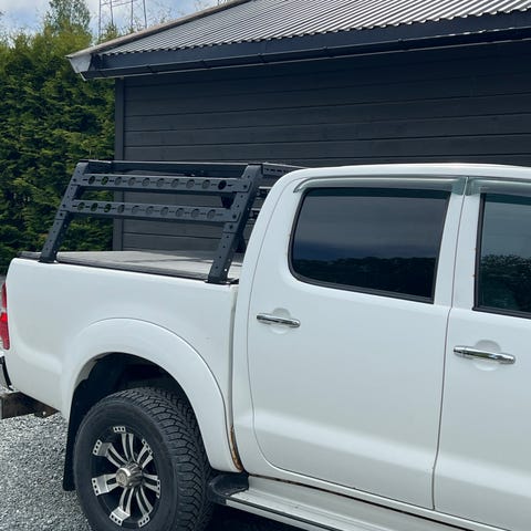 Toyota Hilux hardtop til pickup i hvit utførelse. Hardtopp med sideåpninger og bakluke, tilpasset lasteplanet på Hilux. Egnet for beskyttelse av last og utstyr, og gir ekstra låsbar oppbevaringsplass på bilen. Passer til montering på eksisterende plan, og har integrerte detaljer som håndtak og vinduer etter modelltypen på bildene.