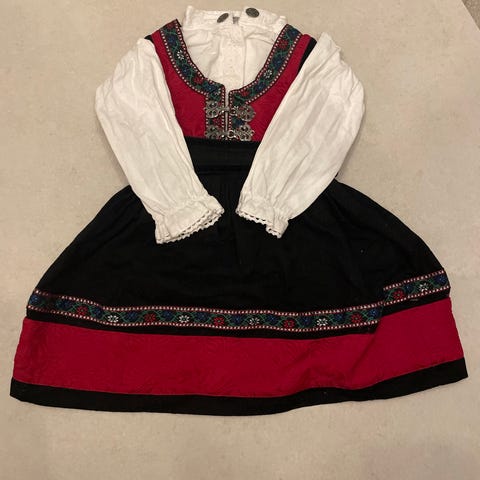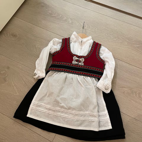 Festdrakt i størrelse 86. Kjøpt på Sparkjøp. Følger med skjortebody med knapper og forkle med belte som kan tas av med borrelås/knapper. Praktisk med knapper langs hele ryggen. Lite brukt. Noen løse tråder og en svak flekk på skjorten. Se bilder. Selger også festdrakt i størrelse 74 og sko i størrelse 21 i annen annonse.
