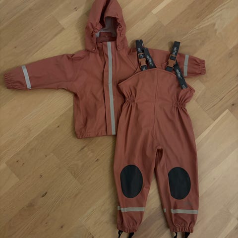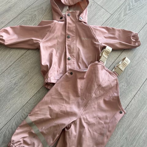 Kuling regntøysett, foret. Sett med jakke og selebukse i søt dusrosa farge. Jakken har avtakbar hette, glidelås og trykknapper foran samt strikk i linning og ermer. Buksen har justerbare seler, glidelås foran, strikk i midje og ben samt refleksdetaljer nederst på bena.