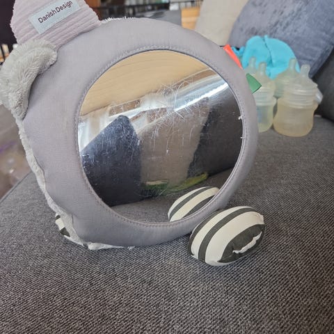 Den andre er en myk speilleke med ramme i stoff og myke føtter med ranglelyd, egnet for visuell stimulering og utforsking. Denne er synlig brukt med merker på speil, se bilde.