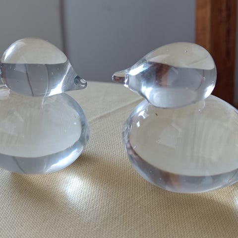 Glassfigurer fugler i klart glass. Settet består av to fugler i ulik størrelse, med avrundet form og små vinger. Passer som dekorasjon i vinduskarm, på hylle eller bord. Laget i gjennomsiktig glass som reflekterer lys fra omgivelsene.