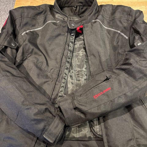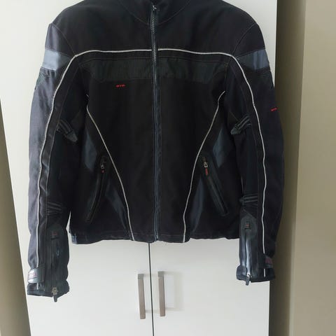 Course MC-jakke i svart tekstil med lyse refleksstriper foran, på ermene og bak. Jakken har CE-merket beskyttelse, justerbar vidde nederst med stropp og borrelås, samt glidelås og knepping i front. Egnet som motorsykkeljakke med innebygd beskyttelse og synlige refleksdetaljer for bruk på vei.