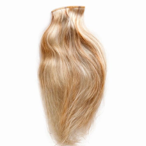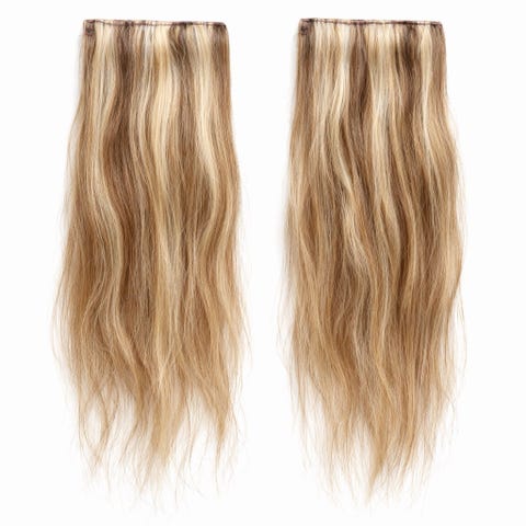 Hårforlengelse med clip-on-fester i blond nyanse. Består av to hårdeler med festekamper/klips øverst. Egnet for midlertidig forlengelse eller ekstra fylde i håret. Kan brukes til hverdags eller ved spesielle anledninger, og festes enkelt inn i eget hår ved hjelp av klipsene.