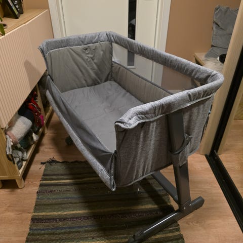 Jollyroom bedside crib i grå tekstil. Sengen står på et stabilt metallstativ med justerbare ben. Langsiden har nettingfelt som gir lufting og innsyn til barnet. Egnet som babyseng ved siden av voksenseng for spedbarn i de første månedene. Tekstiltrekk og madrass følger vanligvis med denne typen bedside crib, og høyden kan ofte justeres for å passe til ulike sengehøyder.