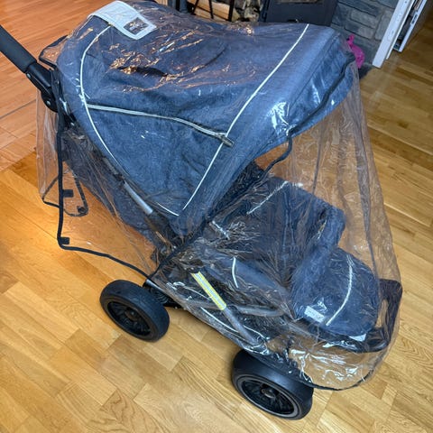Yngri sportsvogn i grønn farge. Vognen har tre hjul med stort forhjul, god ligge- og sitteplass til barnet og justerbare seler. Det er romslig varekurv under setet for oppbevaring. Vognen har frontbøyle og matchende grønt trekk, inkludert beskyttende fotpose/trekk foran. Passer til hverdagsbruk og turer på ulike underlag.