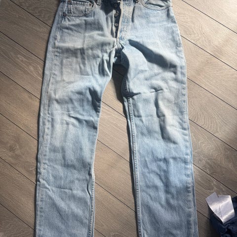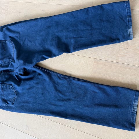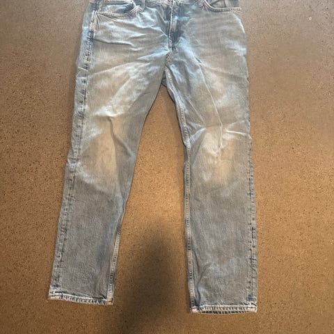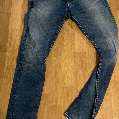 Dr. Denim jeans i blå denim. Buksen er i størrelse W32 og L32 og er laget av bomull. Klassisk 5-lommers modell med gylf og knapp i front. Stoffet har en vasket blå farge og synlige slitasjedetaljer/hull på knærne. Passer som hverdagsbukse eller til avslappede antrekk.