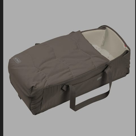 Myk og polstret innside i lys tekstil med lite mønster. Bærebagen har håndtak på sidene for enkel bæring og hel glidelås rundt for å åpne og lukke. Yttermateriale i glatt stoff som er lett å tørke av. Egnet til bruk for spedbarn som liggedel hjemme eller på reise, i seng eller vogn, der produsentens anbefalinger for sikker bruk følges.