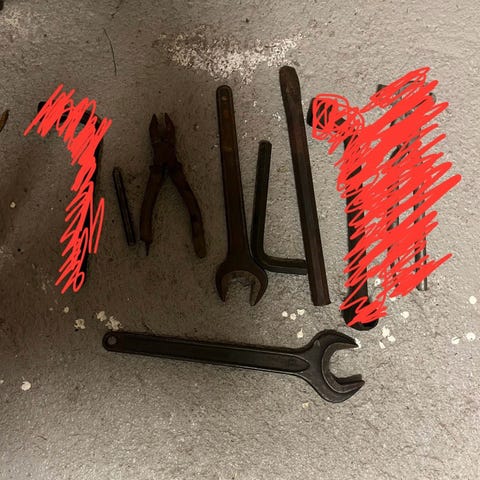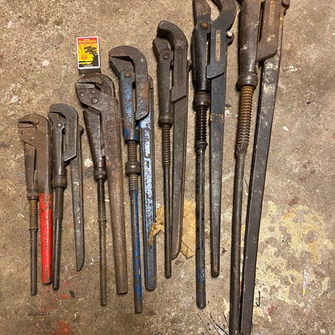 Diverse håndverktøy sett med flere typer hammere og tenger. Bildene viser blant annet slegge, klubbe, smihammer, ulike kombi- og avbitertenger, rørtang og andre spesialtenger. Verktøyene er i metall med treskaft på hammerne. Egner seg til generelt mekanisk arbeid, reparasjoner, metallarbeid og annet håndverk der det er behov for kraftig slagverktøy og ulike typer tenger. Selges samlet som ett parti slik det fremkommer på bildene.