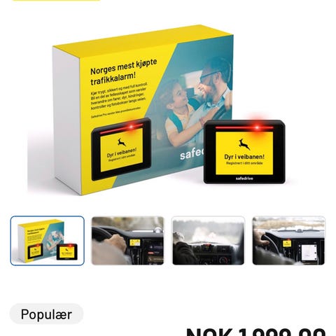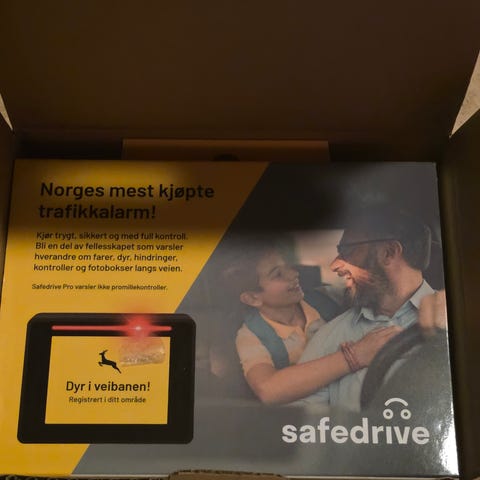 Pakken inneholder blant annet SafeDrive Pro-enhet, USB-kabel, USB-C-adapter, 12 V-adapter (biladapter med 2x USB) og magnetfester for montering. Produktet er beregnet for bruk i bil som varsling ved trafikkrelaterte hendelser langs veien.