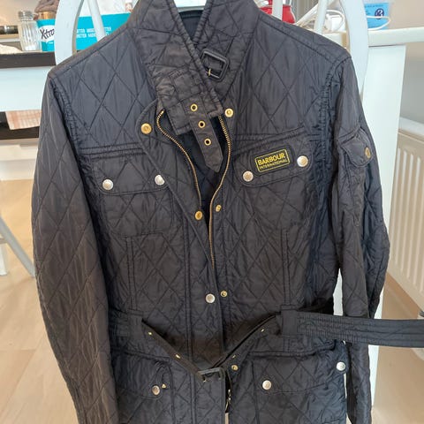 Barbour quiltet jakke for dame i størrelse L. Jakken er svart og laget i polyester med gjennomgående rutemønstret quilting. Modellen har belte i livet, høy krage med spenne og glidelås foran kombinert med trykknapper. Flere lommer med klaff og knapp på fronten samt detaljlommer på ermet. Glidelåsdetaljer på ermene. Egner seg som ytterjakke i overgangssesonger og på kjørlige sommerdager