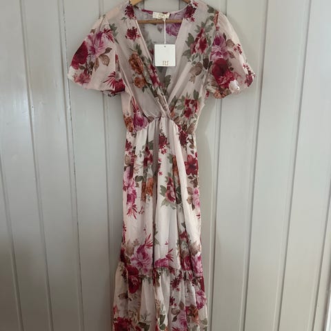 Fra nett: Vakker maxikjole med et nydelig blomsterprint, og plissert skjørt. Kjolen har en smocket, elastisk midje, feminin V-hals og flowy albuelange ermer.