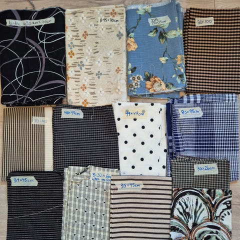 Nye stoffer med forskjellige bredder og høyder selges da syrommet må tømmes da vi flytter fra hus til leilighet.