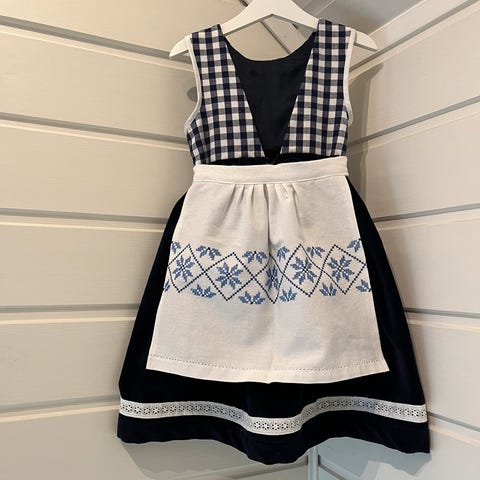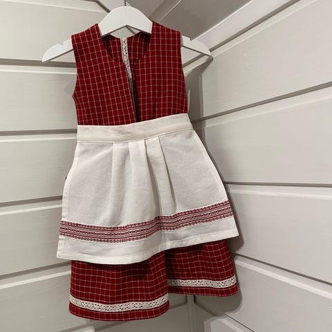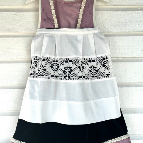 Håndlaget festdrakt i gjenbruksmaterialer. Livet er laget av lin og foret med bomull, stakk og forkle er i bomull.