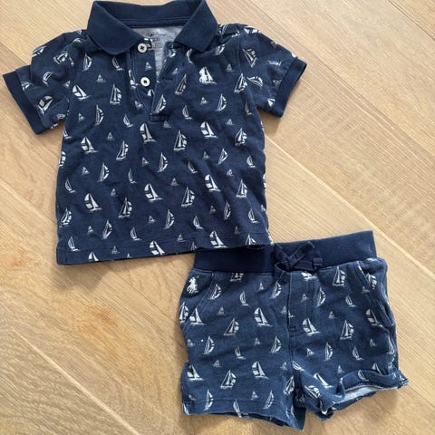 Shorts og t-skjorte fra week-end a la mer fra Frankrike. Supergod kvalitet i bomull og søtt print. Ingen anmerkninger. Det er str.6 mnd, men vi har brukt det ved ca 1 års alder (og han brukte rundt str.80 da).