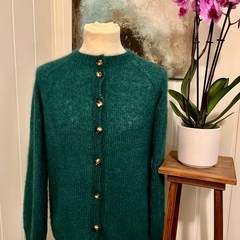 Helt ny hjemmestrikket multe jakke i mohair fra Bella permin. Passer small medium.