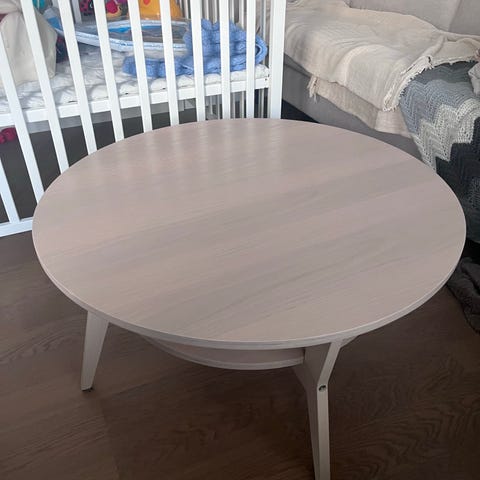 Pent brukt sofabord fra Jysk med betongfarget bordplate og ben/understell i svartfarget metall.