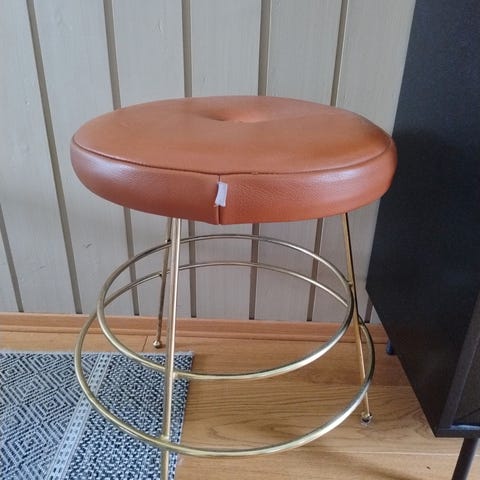 Dette er ikke en moderne kopi, men et genuint vintage-møbel med mange flotte detaljer. Rammen er bygget i ekte bambus med tradisjonelle bambussurringer som skjuler fester og gir styrke. Stolene har meget pent brunt skinn/kunstskinn som matcher fargene i baren perfekt.