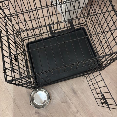 Hundebur i metall med gitterkonstruksjon. Buret har dør i front og på siden med låsemekanisme og sammenleggbar ramme for enkel lagring og transport. Egnet som hvile- og oppholdsplass for hund, samt til bruk i hjemmet eller i bil der størrelsen på buret passer til dyret og tilgjengelig plass. Buret har også håndtak og kan enkelt slås sammen. Buret står slått sammen her nå. Og er nesten ikke brukt.