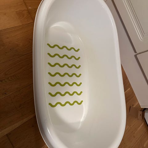 Babybadekar i hvit plast med grønt antiskli-felt i bunnen og på innsiden av ryggstøtten. Badekaret har avrundede kanter og formet liggeflate som gir støtte til babyen under bading. Egnet til bruk i dusj, badekar eller på badegulv, avhengig av plass og behov.