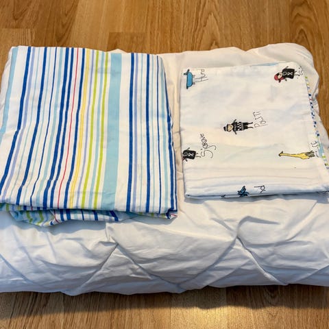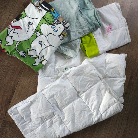 IKEA Småsporre juniordyne, ca 180 cm lang, med fire tilhørende sengesett (dyne- og putetrekk). I god stand!