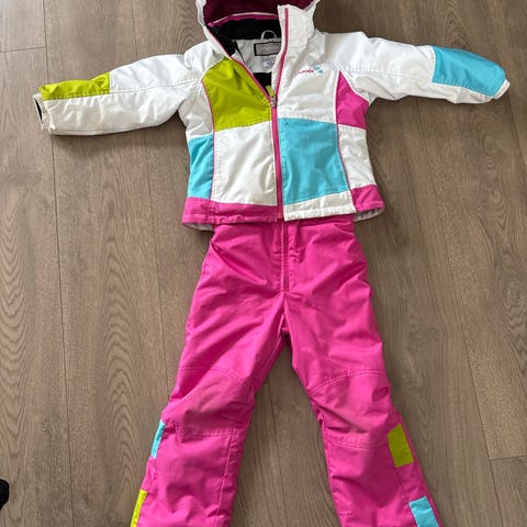 Phenix skidrakt for barn i størrelse 8 år. Sett med rød jakke og turkis selebukse. Jakken har hette og glidelåslukking foran. Buksen har justerbare seler og rette ben. Ytterstoffet er laget for bruk i snø og vintervær. Passer til ski- og uteaktiviteter på kalde dager. Noen bruksmerker, se bilder. Kan sendes