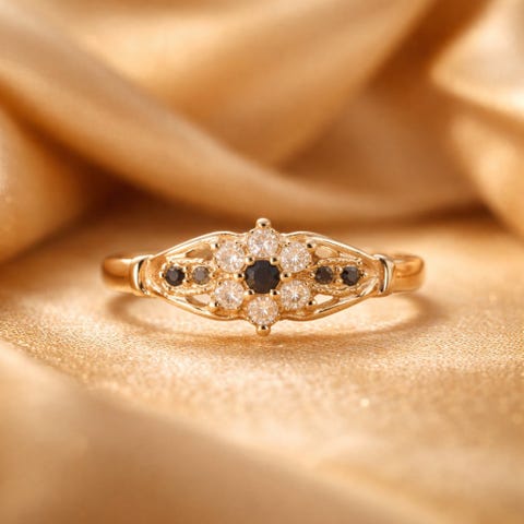 Ringen ble kjøpt på en auksjon for mange år siden. Tror det er diamant, og safir. Men har ikke fått verifisert dette. Ringen er slit der merkingen er, så bare 750, og litt av et merke jeg ikke kjenner som er synlig. Vekt 1,8 gram. Vurderes solg, kom gjerne med et bud.