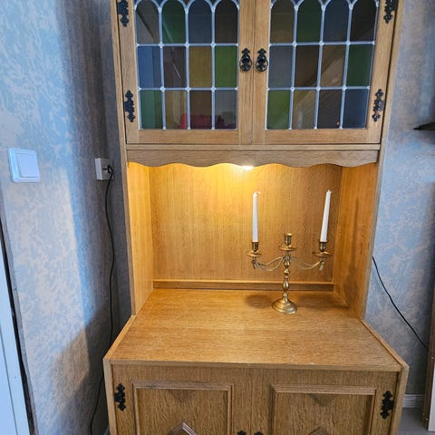 Veldig fint gammelt vitrineskap i eik selges for 900kr. Har integrert lyset.
