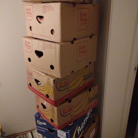 Solide banankasser. Eskene er stablebare og har bærehull på sidene. Egner seg til oppbevaring, flytting eller sortering av ulike gjenstander. Flere esker i standard bananeske-størrelse på bildet.