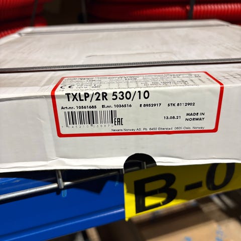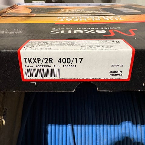 TKXP/2R 400/17 varmekabel. Kabelen leveres på spole, egnet for installasjon som elektrisk gulvvarme eller frostsikring der spesifikasjonen TKXP/2R 400/17 er påkrevd. Produktet er merket «Made in Norway». Nøyaktig lengde, effekt og øvrige tekniske data følger av typenummeret og produsentens dokumentasjon.