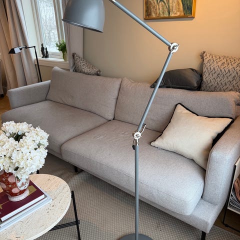 Selger to stk IKEA ARÖD gulvlamper i grå farge med detaljer i børstet metall. Lampen har et industrielt og tidløst uttrykk som passer like godt i stue som på hjemmekontor eller soverom.