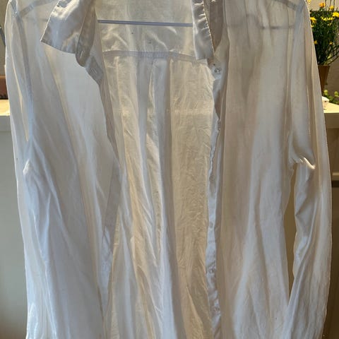 H&M bluse i lett, semitransparent stoff. Blusen er hovedsakelig hvit med motiv av trær i gråtoner og lys rosa bakgrunn på fronten. Rund hals med knappestolpe foran uten synlige knapper. Rett fasong med noe lengre bakstykke. Passer til hverdagsbruk eller til en enkel, penere stil sammen med bukse eller skjørt.