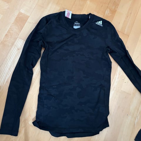 Adidas langermet treningstrøye i størrelse 13-14 år. Trøyen er hovedsakelig svart med grå detaljer på krage, ermer og sider. Laget i syntetisk materiale som tørker raskt og egner seg til trening og annen fysisk aktivitet. Modellen har høy hals med glidelås og tommelhull i ermene for bedre passform. Passer til bruk alene eller som lag under annen bekledning.