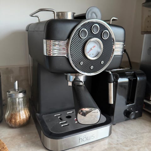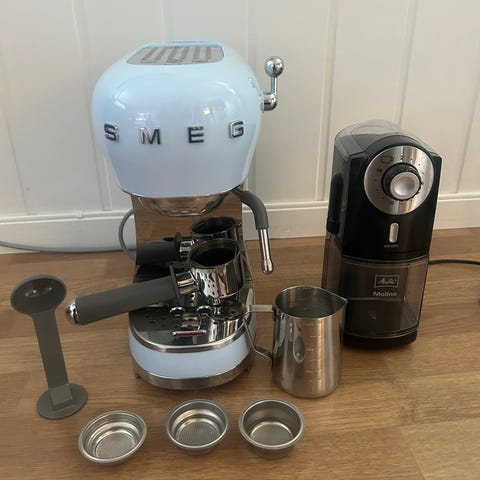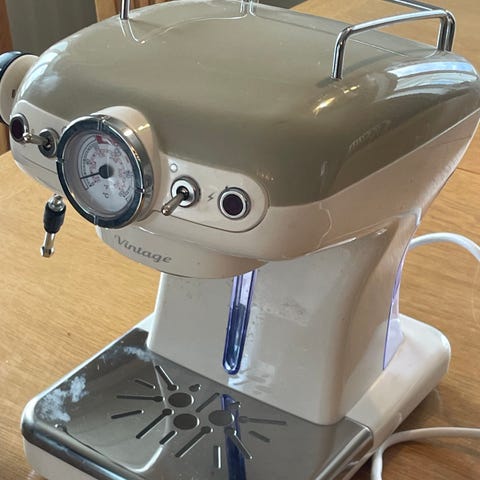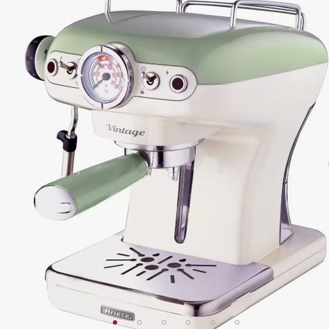 Ariete Vintage espressomaskin i grønn og hvit utførelse. Maskinen har manometer for temperaturkontroll og klassisk betjeningspanel med vippebrytere. Utstyrt med portafilter og damprør for skumming av melk. Passer til tilberedning av espresso og andre kaffedrikker hjemme på kjøkkenbenken.
