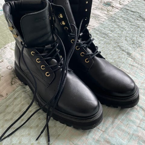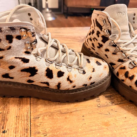 Mono støvler i semsket skinn i brun farge, størrelse 39. Modellen har kraftig yttersåle med grovt mønster, snøring med metallhemper og oransje lisser. Støvlene har ankelhøy skaft med polstret kant for ekstra komfort. Egner seg til hverdagsbruk og tur i variert vær og underlag, avhengig av øvrig bekledning og vedlikehold av skinnet.