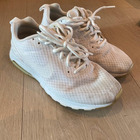 Nike Air Max joggesko i størrelse 45.5Modellen er i helhvit farge med synlig Air Max-demping i sålen. Overdelen er i pustende meshmateriale med lisser for justering av passform. Yttersålen har mønster som gir grep på underlaget. Egner seg til hverdagsbruk og lett trening.