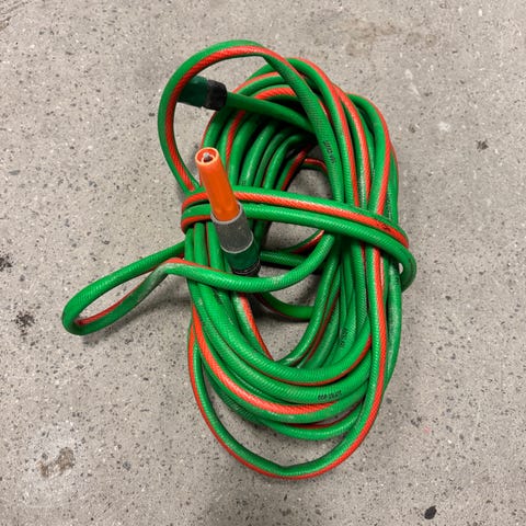 Slangen er i grei stand. Den ligger på rull, uten veggfeste. Dimensjon 1/2 ", 13 mm.