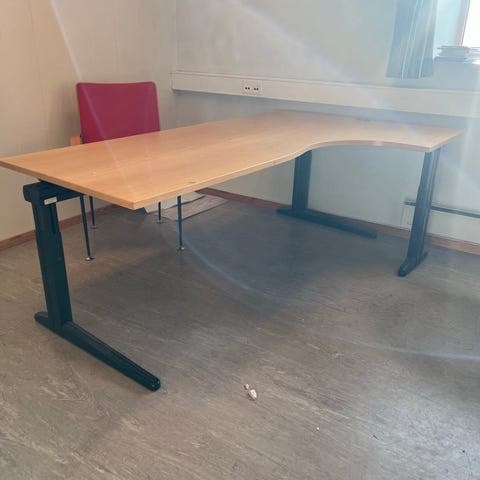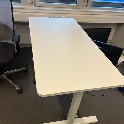 Skrivebordet kan høydejusteres og det er små ben under understellet som kan justeres i forhold til gulvet. Tykk plate. Mer en dobbelt så tykk som feks Bestå skrivebord fra Ikea
