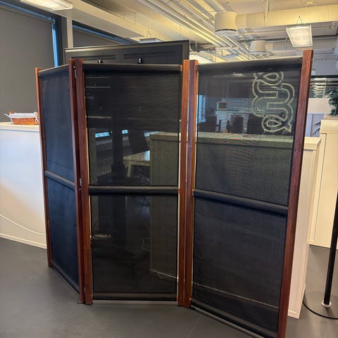 Høyde uten føtter = 136 cm. Total høyde ca 140 cm. Bredde pr. vegg = 84 cm. Begge vegger = 168 cm. Total ytre bredde m/føtter = 179 cm. Ok stand. Trenger en vask og evt. et strøk maling. Justerbare ben. Prisen er samlet for begge.