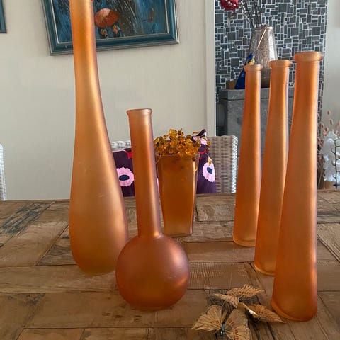 Diverse vaser (16 stk) selges samlet. Vasene er i ulike rosanyanser. Har blitt brukt i forbindelse med dåp.