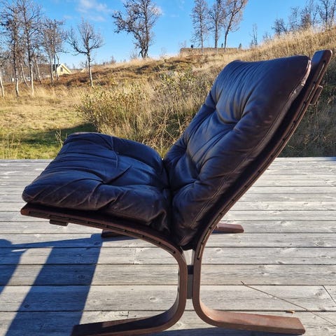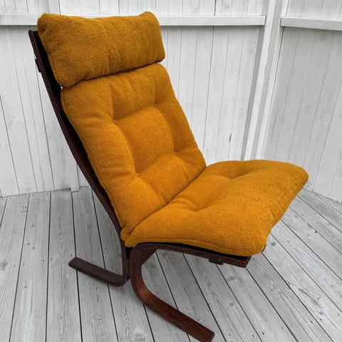 Fin høy Siestastol med burgunder skinnpute eller saueskinn. Renset Canvas og nye snorer.