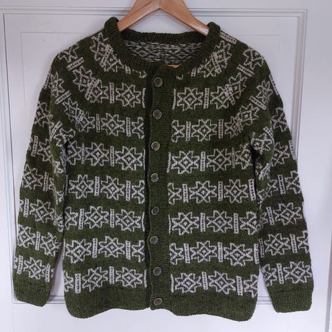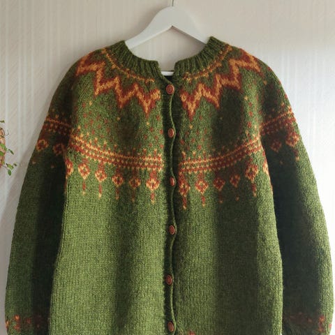 Hjemmestrikket fin grønn ull kofte selges videre. Er ikke brukt av meg da jeg selv kjøpte den brukt og den ble for stor. Tror det er en litt eldre kofte og den har ett lite merke på ene albuen etter å ha blitt stoppet (se bilde). Ellers ser den kjempefin ut. Ingen nupper. Sendes med fiks ferdig.