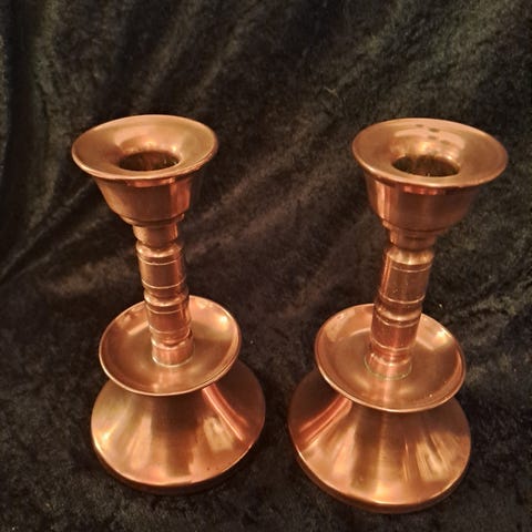 To staselige lysestaker i tinn frå 1960-talet. Overdelen har skålforma lyshaldar som passer til vanlige kubbelys eller dekorlys. Overflata har både glatte og lett strukturerte parti. Egner seg som bord- eller vindusdekor. Kr 400 for begge.