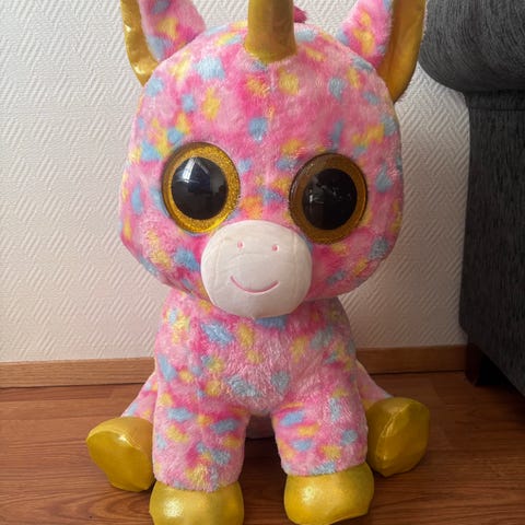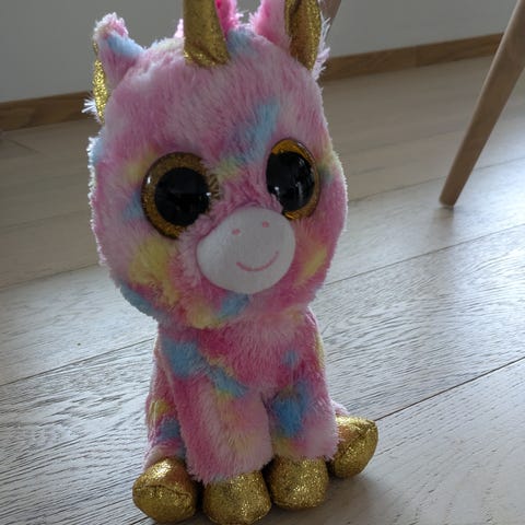 Ty kosedyr formet som en enhjørning i flerfarget myk plysj. Figuren har store øyne, blå glitrende horn, hover og hale. Passer som kosedyr til barn eller som samlefigur for Ty-kosedyr. Pen brukt og trenger en ny eier 🙌🏼🦄