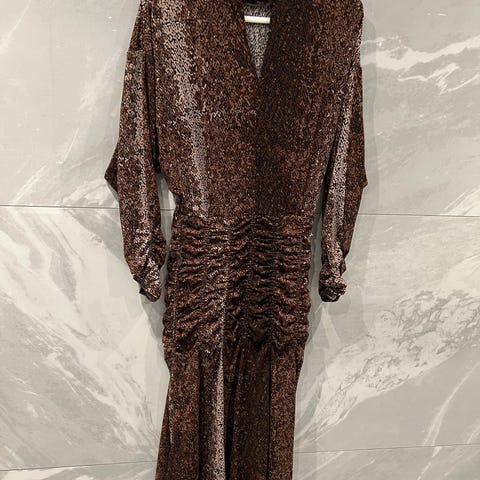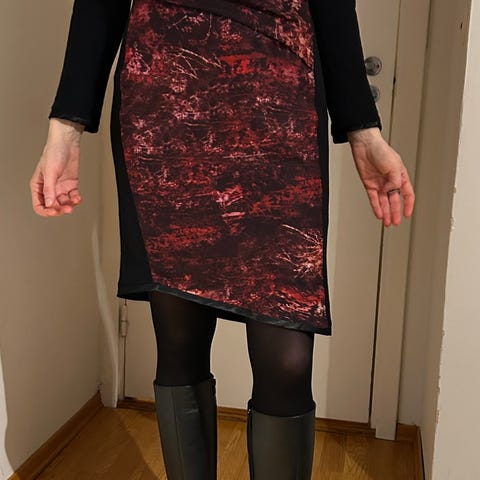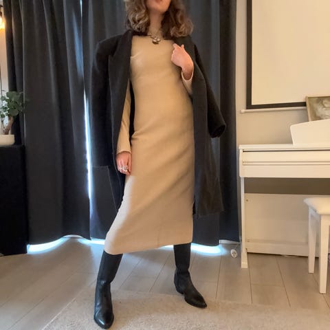 Nydelig strikkekjole med åpne skuldre, som går til knærne på meg (jeg er 173 cm). Perfekt til våren og kombineres enkelt med en vårkåpe og vesker i ulike farger.
