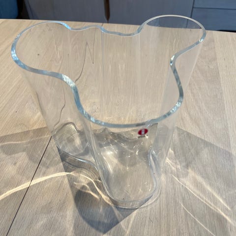 Iittala Aalto vase i klart glass. Klassisk organisk form med bølgende kanter. Egner seg til blomster, dekorasjon eller som frittstående pyntegjenstand. Vasen er i transparent glass som gjør det enkelt å kombinere med annet interiør.