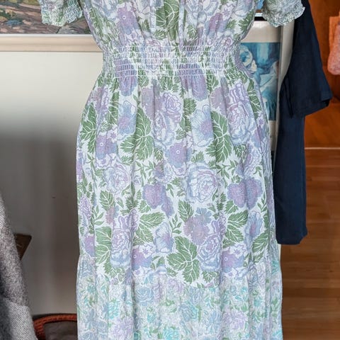 Den har V-utringning, korte ermer og markert liv. Skjørtet er lett utsvingt med splittdetaljer. Baksiden har utskjæring og snøring i ryggen.