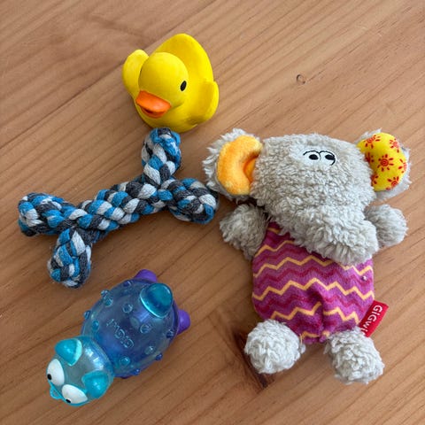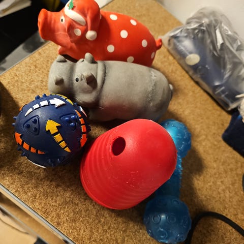 To ubrukte biteleker, en godbit ball og flaske