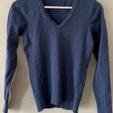 Tommy Hilfiger genser for dame i størrelse M. Genseren er svart og laget av bomull. V-hals og lange ermer. Passer til hverdagsbruk og kan kombineres med både bukse og skjørt.