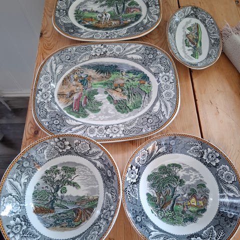 Lite fat og bolle i serien Woodland fra Unicorn tableware, England. Rødrosa dekor på hvit bunn. Fatet måler 29*23,5 cm og bollen har diameter 22 cm. Blanke og fine, ikke krakelering. Fatet har to nag på oversiden, bollen et nag under og to små avskallinger( knappenålshoder). Selges samlet for 450kr eller 250kr pr stk